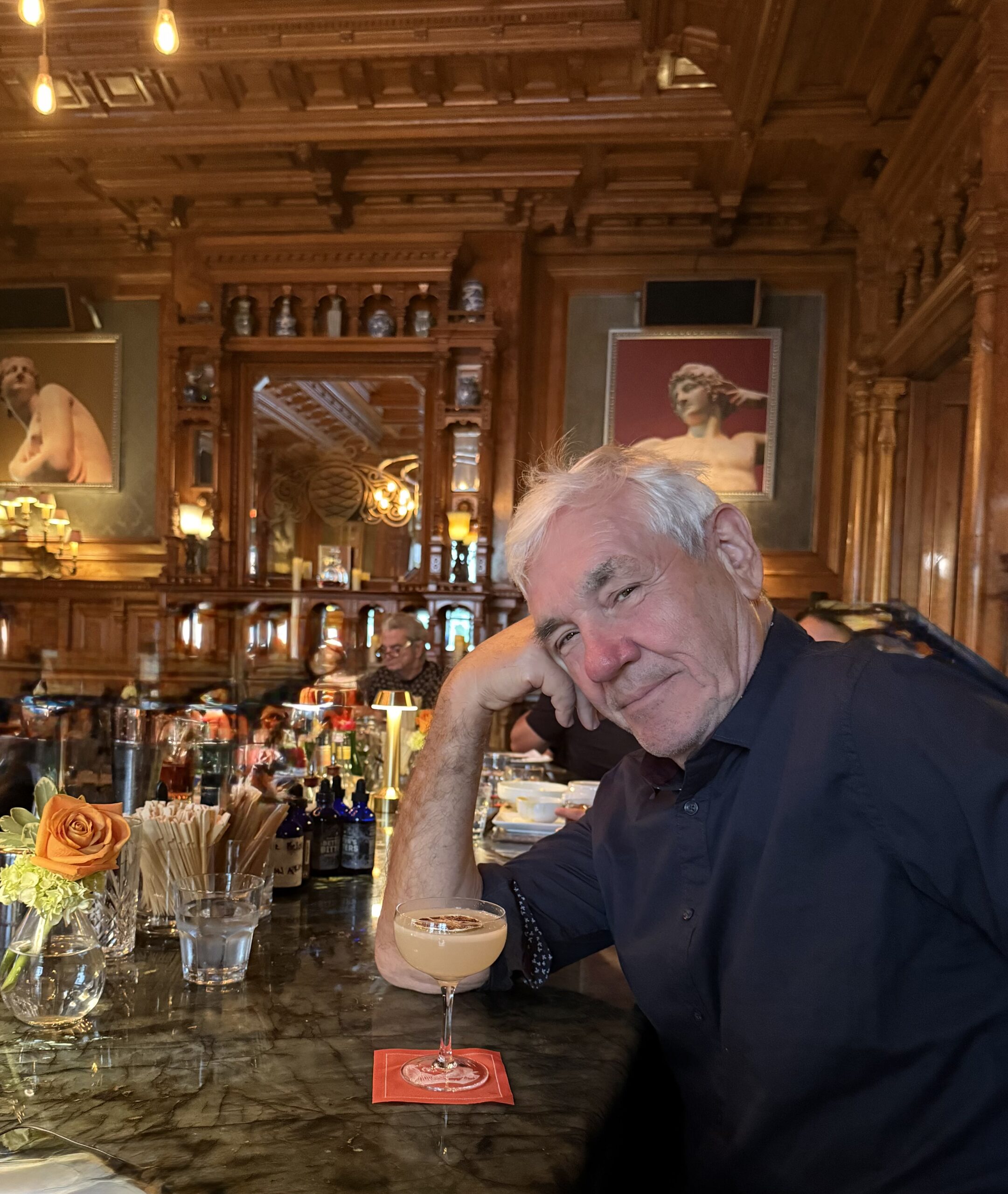 On our first visit, the exterior courtyard is packed, but fortunately the indoor bar is available. And what a stunning experience it is! Imagine a plush room with stained glass windows and gorgeously lacquered wood ceiling and walls — a treatment reminiscent of the woodwork of the Art Nouveau masters of the early 1900s. Food, drinks and service are also stellar. The staff, led by a master bartender, works seamlessly. It’s a always a pleasure to see bartenders concoct cool libations, spend a full minute shaking the drink to make sure all ingredients are nicely blended, and then BOOM, your drink appears, beautifully decorated and very tasty.